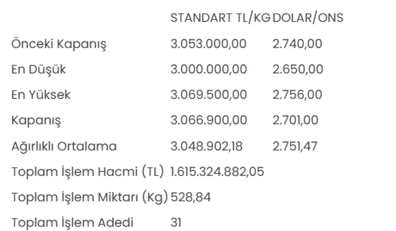 Borsa İstanbul Kıymetli Madenler ve Kıymetli Taşlar Piyasası'nda (KMKTP) standart altının kilogram fiyatı 3 milyon 66 bin 900 liraya yükseldi.