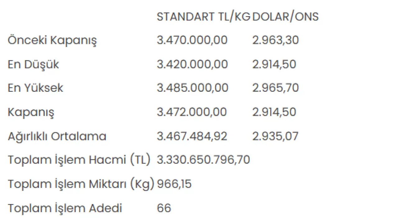 KMKTP'de altında toplam işlem hacmi 3 milyar 330 milyon 650 bin 796,70 lira, işlem miktarı ise 966,15 kilogram oldu.