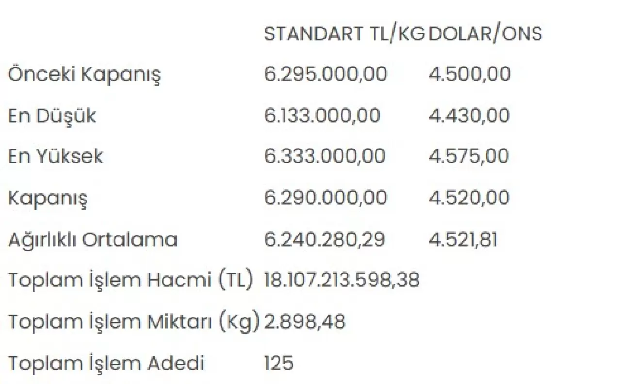 Gün içinde 6 milyon 133 bin lirayla en düşük seviyesini gören ve en yüksek 6 milyon 333 bin liraya kadar çıkan standart altının kilogram fiyatı, kapanışta önceki güne göre yüzde 0,1 değer kaybederek 6 milyon 290 bin liradan işlem gördü. Bir önceki günün kapanış fiyatı ise 6 milyon 295 bin lira olmuştu.