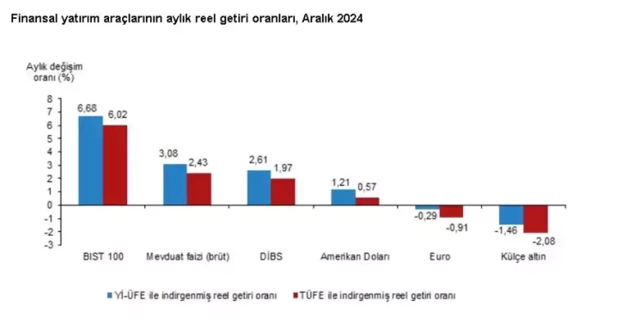Türkiye İstatistik Kurumu (TÜİK), Aralık 2024 dönemi ve geçen yıl geneline ilişkin "finansal yatırım araçlarının reel getiri oranları"nı açıkladı.