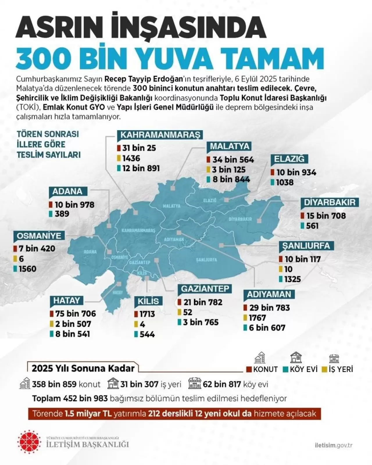 Paylaşımda, deprem bölgesindeki illerde yapımı tamamlanarak hak sahiplerine teslim edilecek konut, köy evi ve iş yerlerine ilişkin bir infografik de yer aldı.