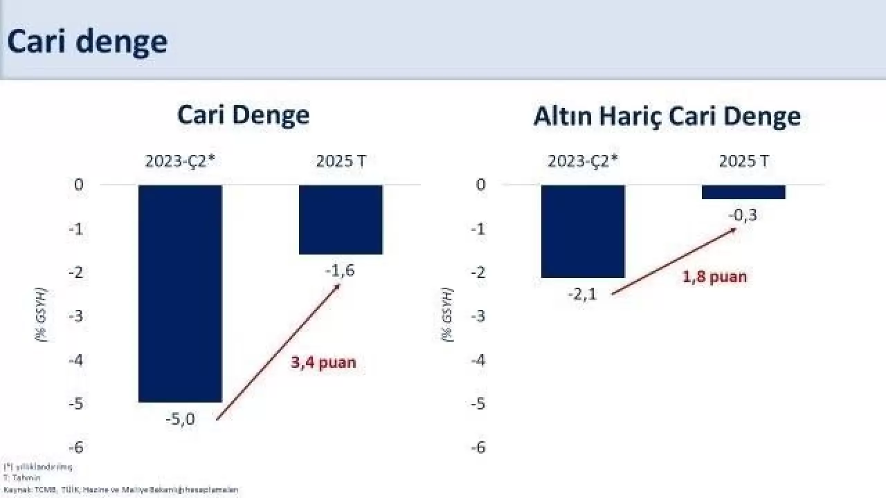 Şimşek, 2025'te bu oranın yüzde 1,6 olmasını beklediklerini belirterek, "Tasarruf tercihlerinde önemli yeri olan altın hariç tutulduğunda, 2003-2023 döneminde milli gelire oranla ortalama yüzde 3 açık gerçekleşirken 2024'te yüzde 0,2 fazla verdik. 2025 yılında ise yüzde 0,3 gibi sınırlı bir açık öngörüyoruz." değerlendirmesinde bulundu.