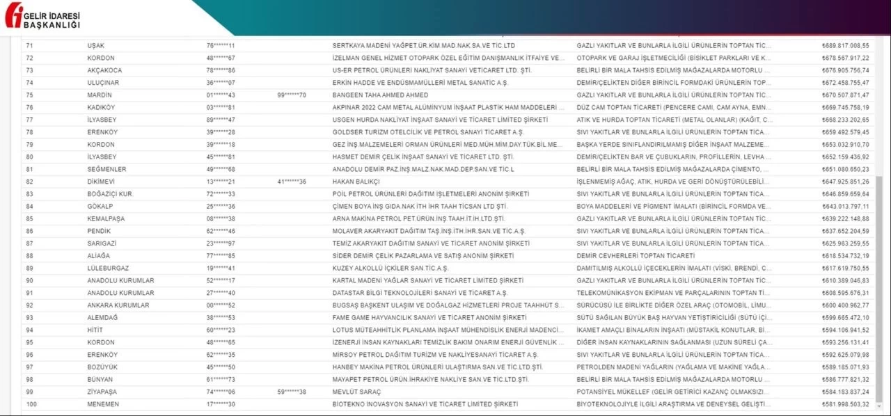 31 Aralık 2023 tarihi itibarıyla vadesi geldiği halde 30 Eylül 2024 tarihi itibarıyla ödenmemiş bulunan ve 5 milyon TL'yi aşan borçlu mükellefler listesi