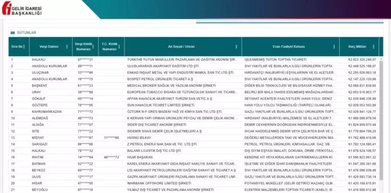 Borçlu mükellefleri iki liste halinde yayınlandı. Listenin ilk kısmında ikmalen, resen veya idarece yapılan tarhiyatlar nedeniyle kesinleşen vergi ve cezaları bulunuyor. Listenin ikinci sırasında ise vadesi geçtiği halde ödenmemiş vergi ve cezalarının kamuoyuyla paylaşıldığı bölüm yer alıyor.