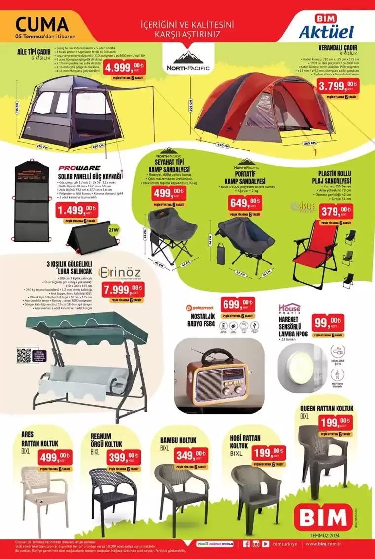 Kamp yapmak isteyenler için BİM mağazalarında genellikle uygun fiyatlarla satılan pek çok ürün bulunmaktadır. Kamp malzemeleri arasında çadır, mat, uyku tulumu, kamp lambası, matara gibi temel ekipmanlar BİM mağazalarının raflarında yerini alıyor. Ayrıca kamp yaparken pratiklik sağlayacak malzemeler de BİM'de satılacak.