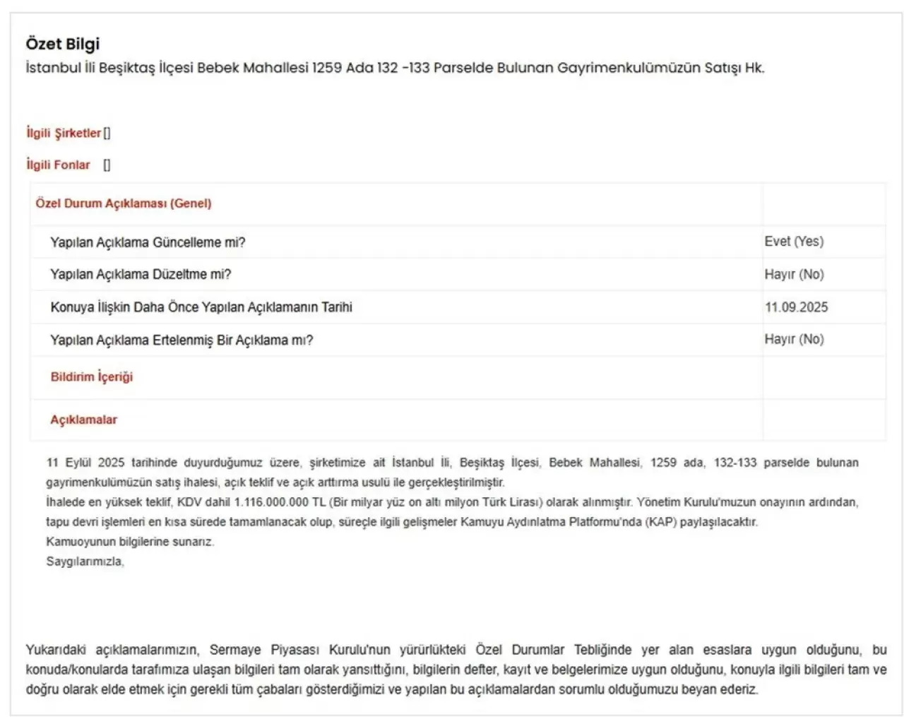 "11 Eylül 2025 tarihinde duyurduğumuz üzere, şirketimize ait İstanbul İli, Beşiktaş İlçesi, Bebek Mahallesi, 1259 ada, 132-133 parselde bulunan gayrimenkulümüzün satış ihalesi, açık teklif ve açık arttırma usulü ile gerçekleştirilmiştir.