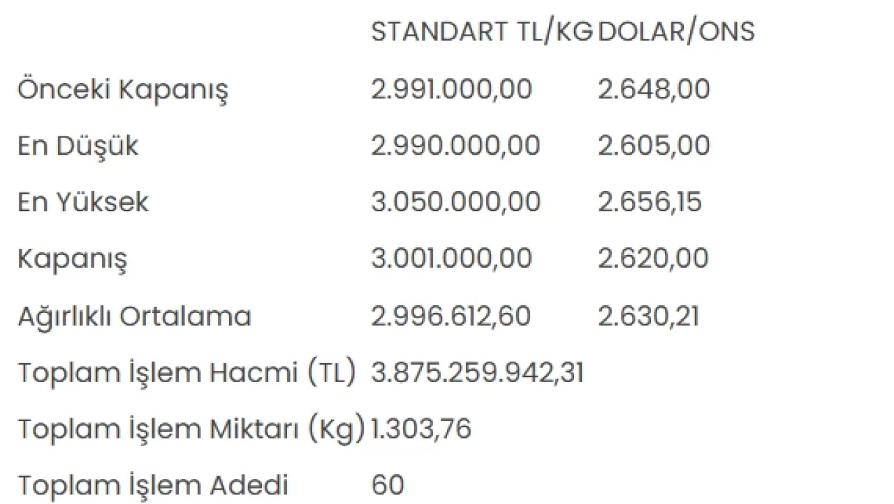 Altın piyasasında toplam işlem hacmi 3 milyar 875 milyon 259 bin 942,31 lira, işlem miktarı ise 1.303,76 kilogram olarak gerçekleşti. Tüm metallerdeki toplam işlem hacmi ise 4 milyar 33 milyon 799 bin 985,88 lirayı buldu.