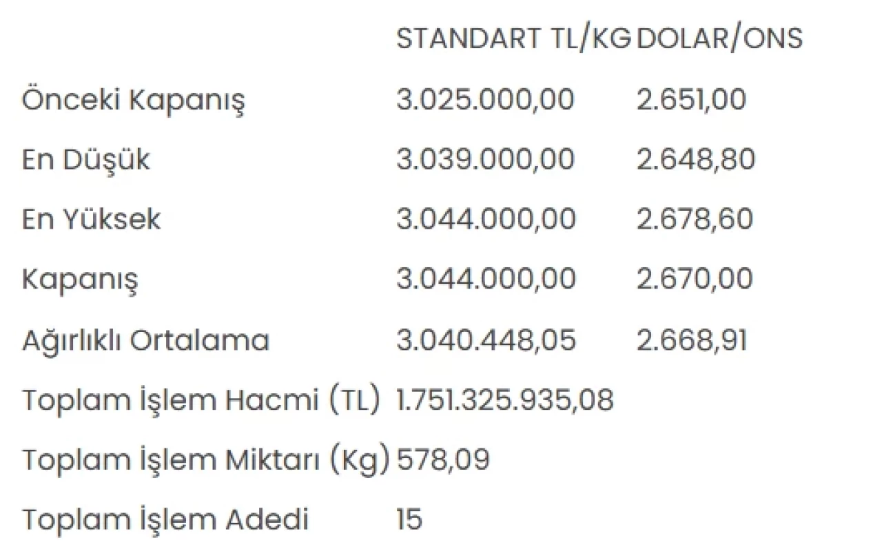 Borsa İstanbul Kıymetli Madenler ve Kıymetli Taşlar Piyasası'nda (KMKTP) standart altının kilogram fiyatı, bugün yüzde 0,6 artışla 3 milyon 44 bin liraya çıkarak dikkat çekti.