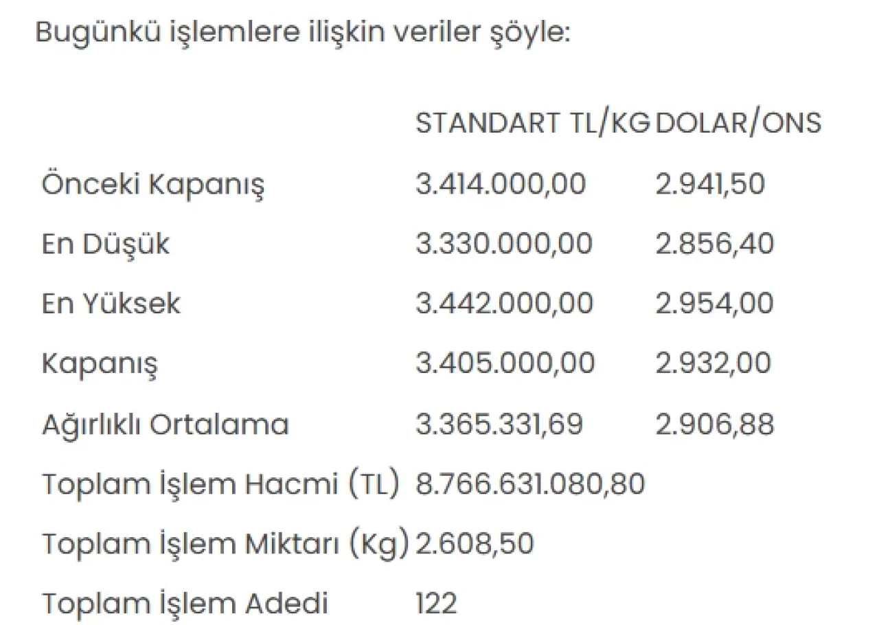 Gün içinde en düşük 3 milyon 330 bin lira, en yüksek ise 3 milyon 442 bin lira seviyeleri görüldü. Önceki kapanışını 3 milyon 414 bin lira seviyesinde yapan altın, bugünkü kapanışını 3 milyon 405 bin lira olarak gerçekleştirdi.