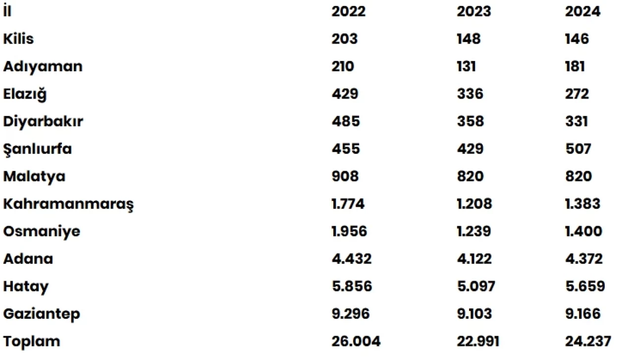 Depremin ardından duraksayan ekonomik faaliyetler destek ve teşviklerle yeniden hızlanma sürecine girdi. Bu kapsamda bölge illerinin ihracatı geçen yıl, 2024'te bir önceki yıla göre yüzde 5,4 artışla 24 milyar 237 milyon dolar olarak gerçekleşti. Bu illerin ülke ihracatı içerisindeki payı 2023'te yüzde 9 iken bu pay geçen yıl itibarıyla da yüzde 9,3'e oldu.