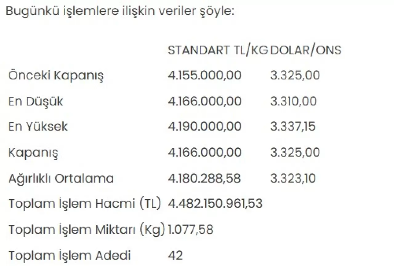 Gün içinde en düşük 4 milyon 166 bin lira, en yüksek ise 4 milyon 190 bin lira seviyeleri görüldü. Dolar bazında ise ons fiyatı en düşük 3.310,00, en yüksek 3.337,15 doları test ederken, kapanış 3.325,00 dolardan gerçekleşti.