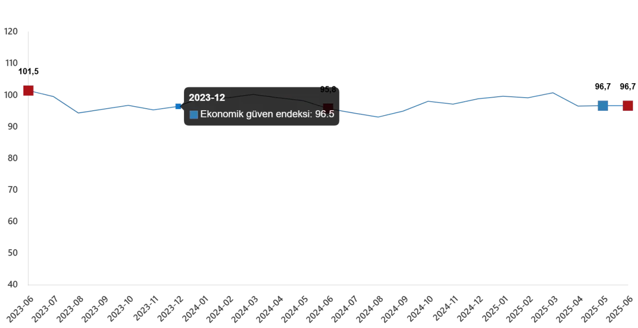 Türkiye İstatistik Kurumu (TÜİK), Haziran 2025’e ilişkin ekonomik güven endeksi verilerini kamuoyuyla paylaştı. Buna göre, mayıs ayında 96,65 olan ekonomik güven endeksi, haziranda yüzde 0,1 oranında sınırlı bir artış göstererek 96,71 seviyesine yükseldi.