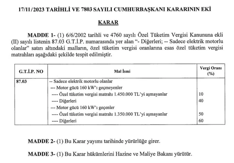 Kararla, motor gücü 160 kW'ın altındaki sadece elektrik motorlu olan binek otomobiller için ÖTV oranına esas ÖTV matrahında değişikliğe gidildi.