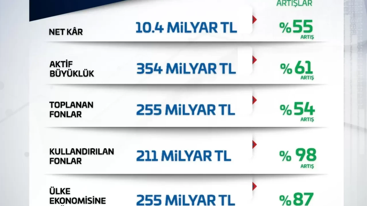 Geçtiğimiz yılın aynı dönemine göre %87 artışla ülke ekonomisine 255 Milyar TL kaynak sağlayan Emlak Katılım, aynı dönemde net kârını %55 oranında artırarak 10.4 Milyar TL’ye çıkardı. Aktif büyüklüğünü 354 Milyar TL’ye ulaştıran Emlak Katılım, toplanan fonlarını 255 Milyar TL’ye yükseltti. Aynı dönemde kullandırılan fon büyümesi %98 düzeyinde gerçekleşirken %1.46 seviyesindeki takibe dönüşüm oranı ve %19.61 sermaye yeterliliği oranı ile sektördeki sağlam duruşunu pekiştirdi. Güçlü sermaye yapısı ve etkin risk yönetimiyle desteklenen istikrarlı operasyonel faaliyetleri sayesinde 2025 yılı üçüncü çeyreğinde özkaynak kârlılığını %60 seviyesinde tamamladı.