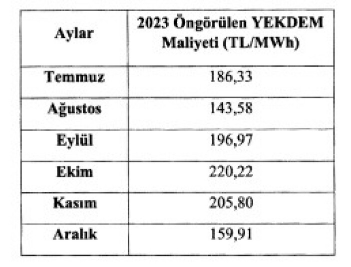 Maliyet megavatsaat başına 186 lira 33 kuruş, ağustos için 143 lira 58 kuruş, eylül için 196 lira 97 kuruş, ekim için 220 lira 22 kuruş, kasım için 205 lira 80 kuruş, aralık için de 159 lira 91 kuruş olarak açıklandı.