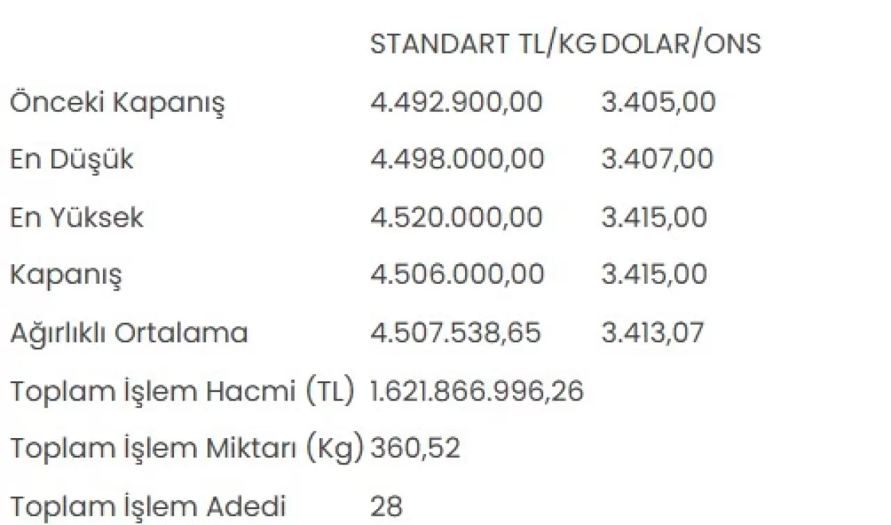 KMKTP'de altında toplam işlem hacmi 1 milyar 621 milyon 866 bin 996,26 lira, işlem miktarı ise 360,52 kilogram oldu.