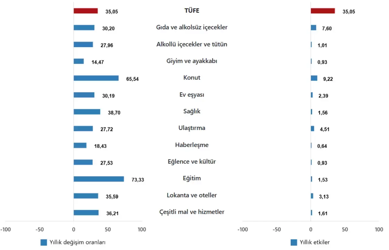 Ana harcama grupları içinde yıllık bazda en yüksek artış konut grubunda gerçekleşti. Bu alanda fiyatlar yüzde 65,54 oranında yükselirken, genel enflasyona etkisi 9,22 puan oldu.
