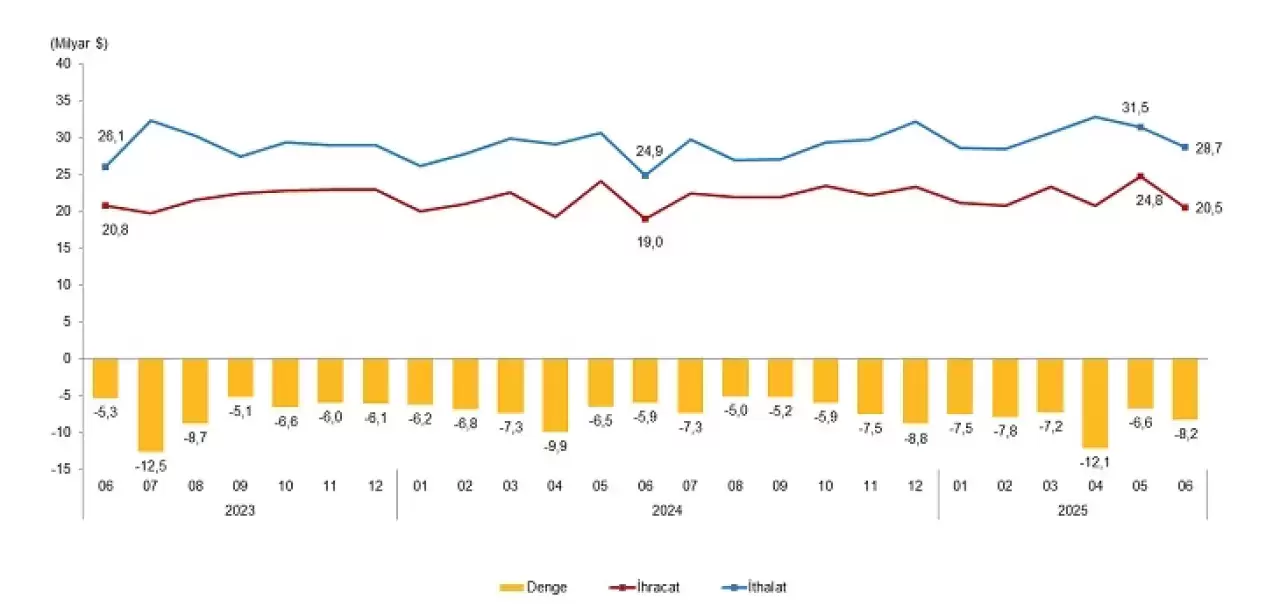 Türkiye İstatistik Kurumu (TÜİK) ve Ticaret Bakanlığı verilerine göre, 2025 yılı Haziran ayında ihracat geçen yılın aynı ayına kıyasla %7,9 artarak 20 milyar 515 milyon dolar, ithalat ise %15,2 artışla 28 milyar 688 milyon dolar oldu. Böylece dış ticaret açığı bir önceki yılın aynı ayına göre %38,8 yükselerek 8 milyar 173 milyon dolara çıktı.