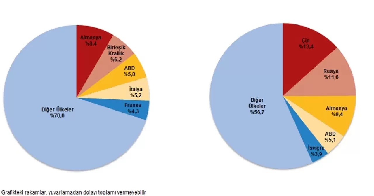 İthalatta ise 3 milyar 831 milyon dolar ile Çin ilk sırada yer aldı. Onu Rusya Federasyonu, Almanya, ABD ve İsviçre takip etti.