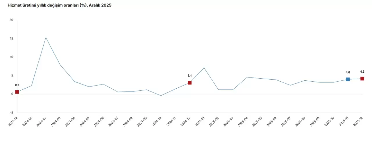 Türkiye İstatistik Kurumu (TÜİK), Aralık 2025 dönemine ait hizmet üretim endeksi sonuçlarını yayımladı. Verilere göre hizmet üretimi, bir önceki yılın aynı ayına kıyasla yüzde 4,2 yükseldi.