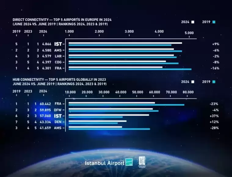 Açıklamada, "ACI Europe Havalimanı Endüstrisi Bağlantı Raporu'na göre İGA İstanbul Havalimanı, doğrudan bağlantıda %9 artışla Avrupa'da 1'inci, hub bağlantıda ise %37 artışla dünyada 3'üncü sırada yer alıyor. Dünya için küresel bir merkez olmaya devam edeceğiz." denildi.