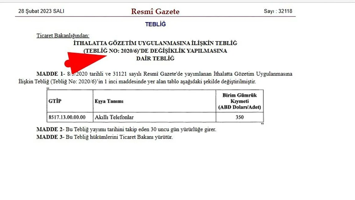 Geçen ay Resmi Gazete'de yayımlanan İthalatta Gözetim Uygulanmasına İlişkin Tebliğ'de Değişiklik Yapılmasına Dair Tebliğ ile akıllı telefonlarda adet başına birim gümrük kıymeti, 200 dolardan 350 dolara yükseltildi.