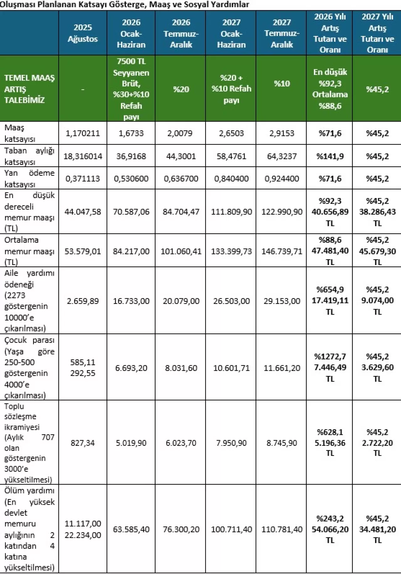 Konfederasyon, 2026 yılı sonu itibarıyla en düşük memur maaşının 84 bin 704 TL’ye, 2027 sonunda ise 122 bin 991 TL’ye çıkarılması gerektiğini açıkladı. Bu doğrultuda, memur maaşlarına 2026 yılı için refah payı dahil %92,3; 2027 yılı içinse %45,2 oranında zam yapılması talep edildi.