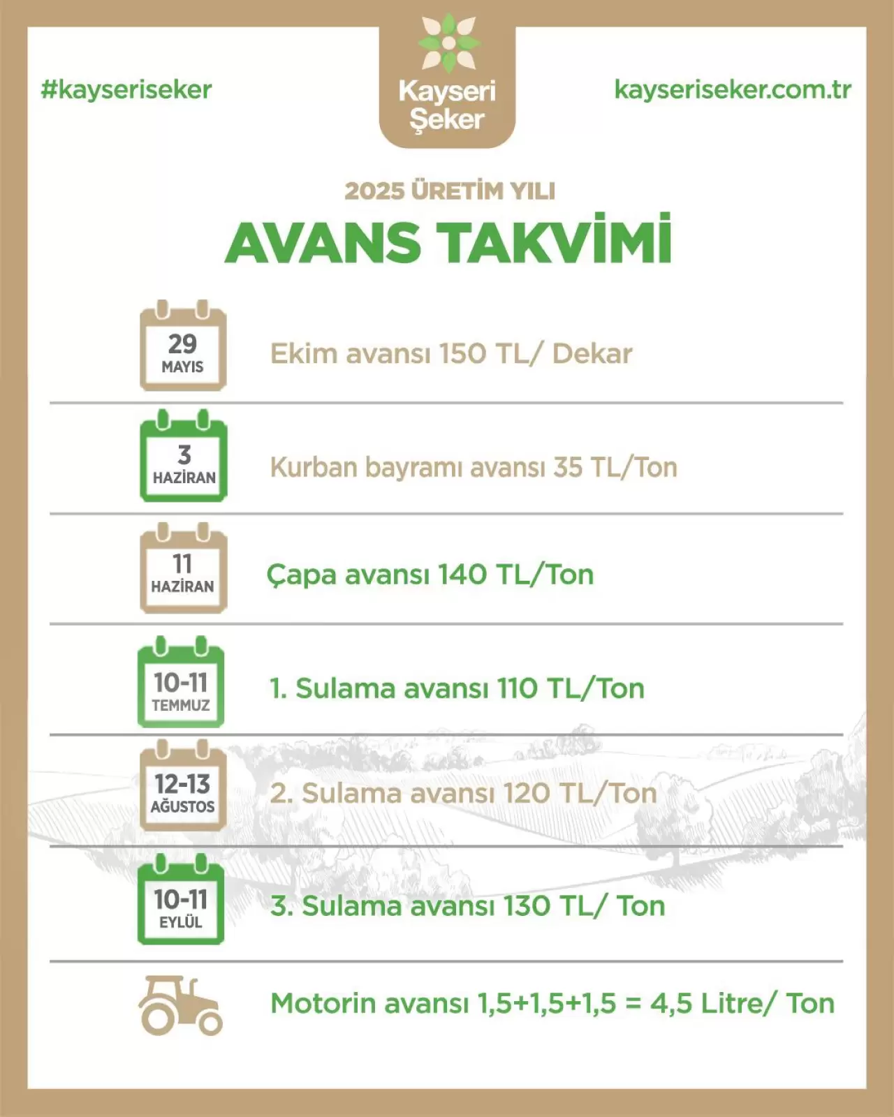 Pancar ekiminin başlangıcından bu yana verdiği tohum, gübre, ilaç, motorin gibi ayni ve ekim, çapa, bayram, sulama, söküm gibi nakdi avanslarla üreticiyi tarlada yalnız bırakmayan Kayseri Şeker, yine çiftçisine destek vermek amacıyla her yıl düzenli olarak yapılan avans ödemelerine ilişkin 2025 üretim yılı avans ödeme takvimini açıkladı.
