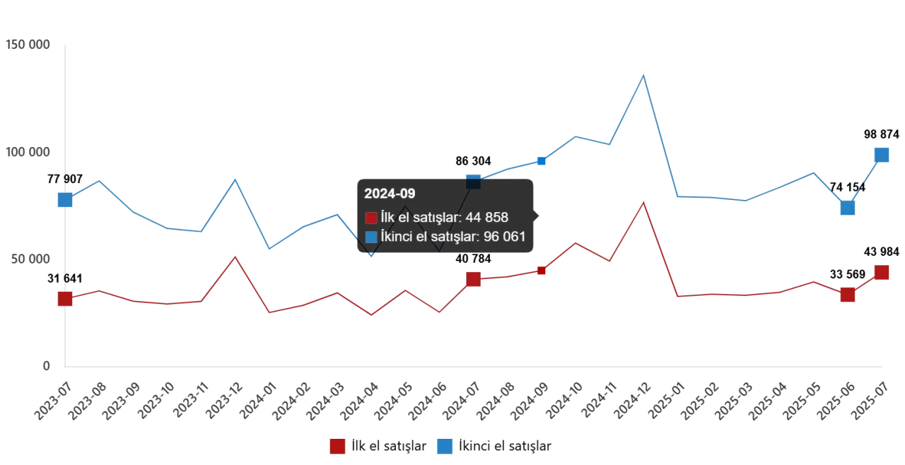 Yılın ilk yedi ayında ise ilk el satışlar 251 bin 608 (%17,5 artış), ikinci el satışlar 583 bin 143 (%27,3 artış) olarak gerçekleşti.