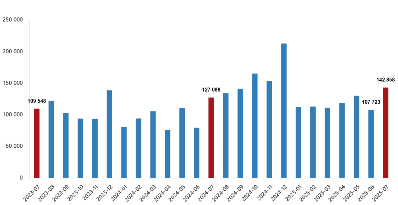 Türkiye İstatistik Kurumu (TÜİK), Temmuz 2025’e ilişkin konut satış verilerini yayımladı. Buna göre, Türkiye genelinde konut satışları geçen yılın aynı ayına kıyasla %12,4 artarak 142 bin 858 oldu.