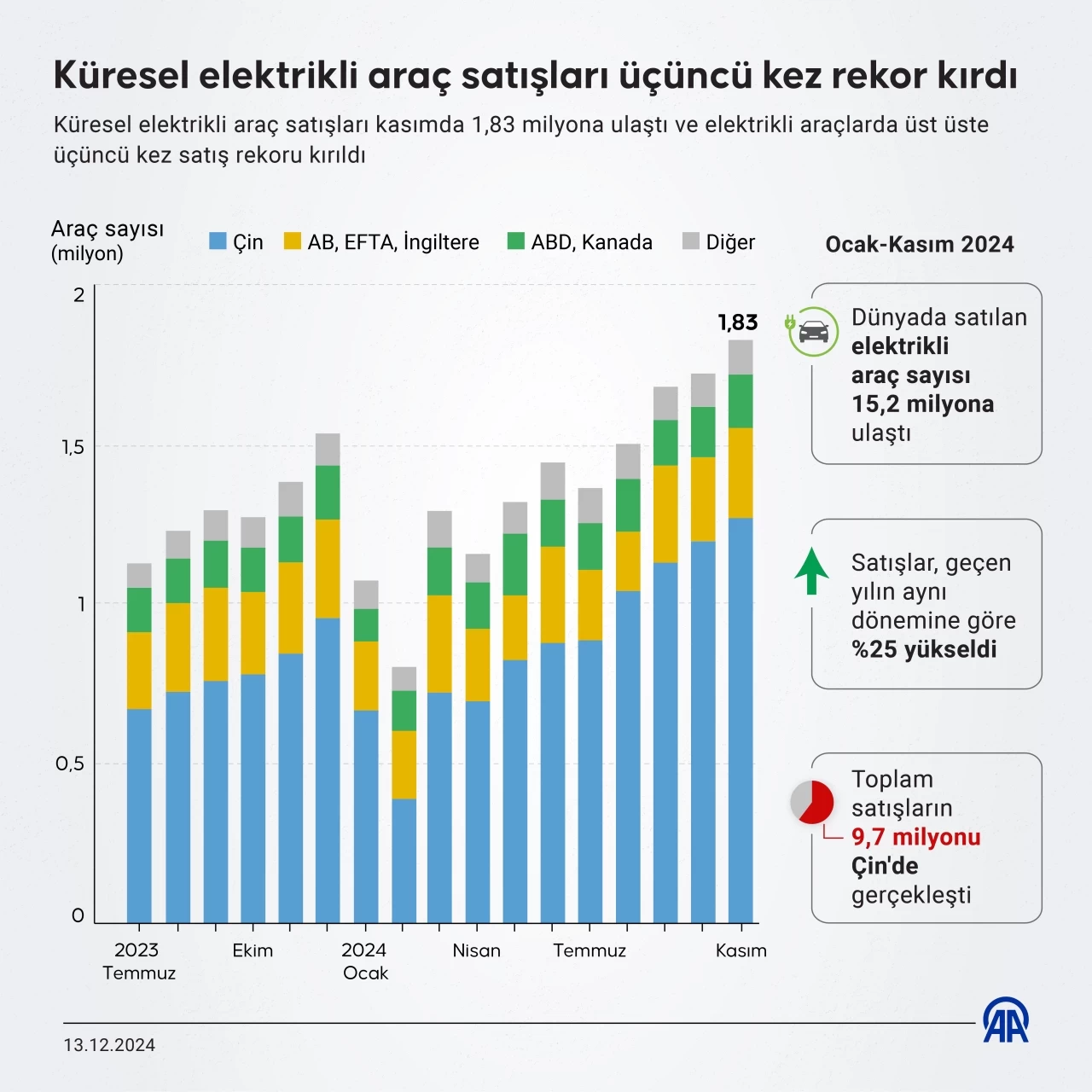 Dünya genelinde ocak-kasım döneminde satılan elektrikli araç sayısı 15,2 milyona ulaştı. Bu dönemdeki toplam satışların neredeyse üçte ikisi Çin'de gerçekleşti.