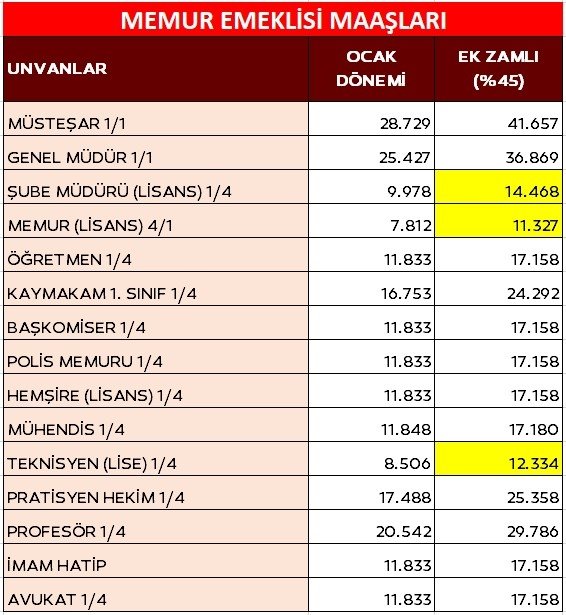 7 bin 901 TL alan memur emeklisi maaşı da aynı oranda yükselirse bu rakam 14 bin 671 TL olacak. Kamu işçisine yapılan yüzde 45'lik zam oranı burada tüm memur maaşları için bir referans olacak.