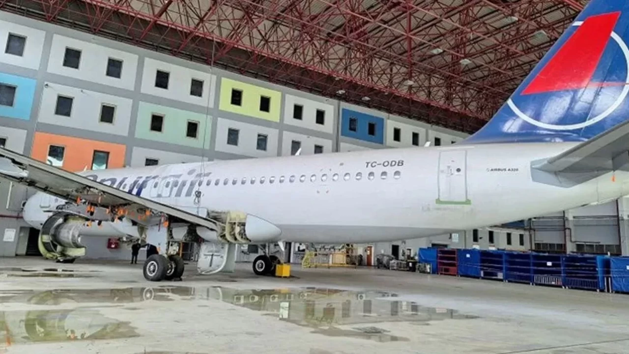 1996 model, Airbus A320-232 Atatürk Havalimanı Hangarı'nda park edilmiş halde bekliyor.