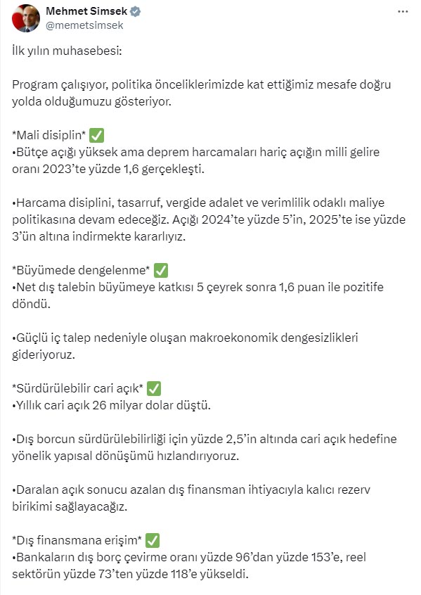 Şimşek, mesajında şunları kaydetti: "Yıllık enflasyonda en yüksek seviye geride kaldı. Enflasyonda belirgin ve kalıcı düşüş dönemine giriyoruz. Piyasanın 12 ay sonrası enflasyon beklentisi yüzde 33,2, 24 ay sonrası beklentisi yüzde 21,3 seviyesinde. Güven artıyor. Risk primimiz CDS 440 baz puan düştü. Kredi notumuz arttı, görünümümüz pozitif. Gri listeden çıkış sürecinde teknik çalışmalar tamamlandı, yerinde denetim yapıldı. Teknik rapor olumlu. Kara paranın aklanması ve terörizmin finansmanı ile mücadelede kararlıyız. Yapısal dönüşümde yeni sanayi politikası uyguluyoruz. İkiz dönüşümü hızlandırıyoruz. Yatırım ortamının iyileştirilmesi ile uluslararası doğrudan yatırımları artırmayı hedefliyoruz. Sonuç olarak; program çalışıyor ama daha kat edecek yolumuz var. Enflasyonu tek haneye indirmek meşakkatli olsa da programımızı kararlılıkla uygulayarak başaracağız. Tüm hedeflerimize ulaşmakta kararlıyız."