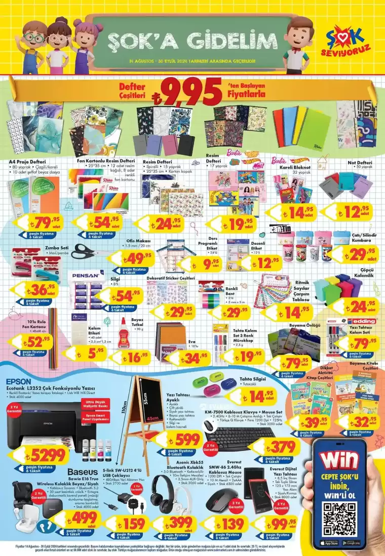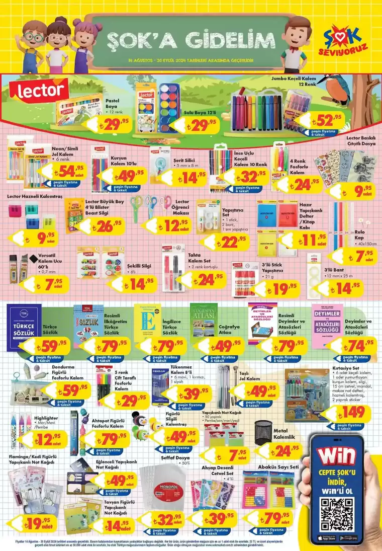 Fotokopi kağıdı, flüt, mantar pano, tuval, suluboya fırçası ve ambalaj lastiği gibi ihtiyacınız olan kırtasiye ekipmanları Şok 14 Ağustos kataloglarında bulacaksınız.