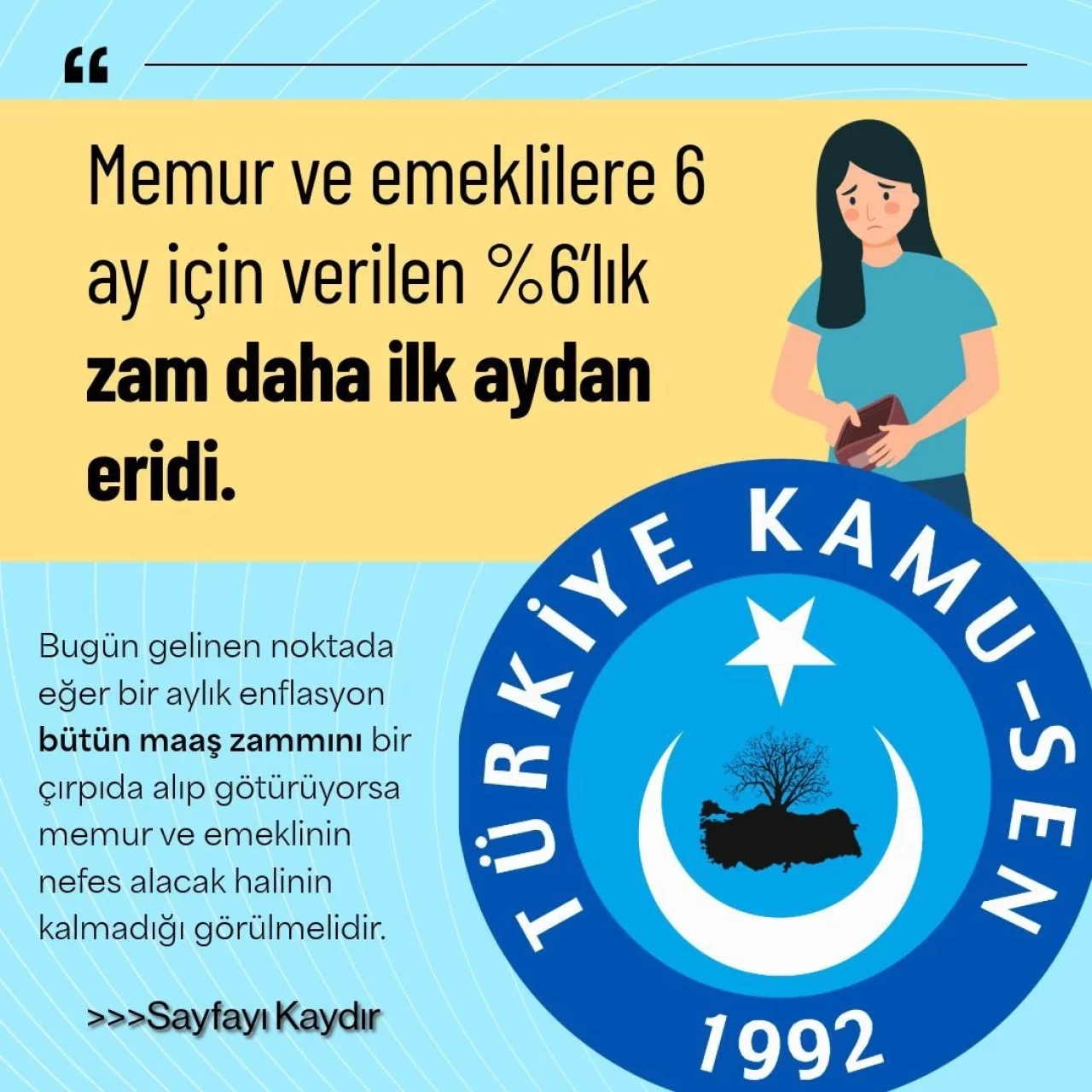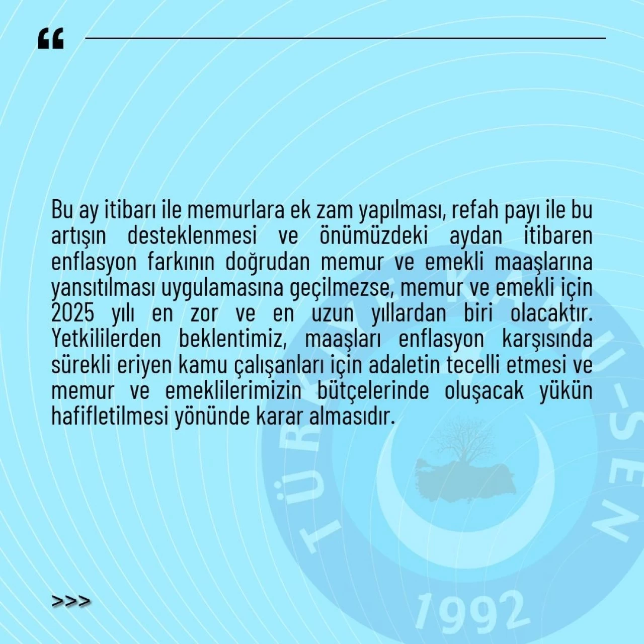 Bu ay itibarı ile memurlara ek zam yapılması, refah payı ile bu artışın desteklenmesi ve önümüzdeki aydan itibaren enflasyon farkının doğrudan memur ve emekli maaşlarına yansıtılması uygulamasına geçilmezse, memur ve emekli için 2025 yılı en zor ve en uzun yıllardan biri olacaktır. Yetkililerden beklentimiz, maaşları enflasyon karşısında sürekli eriyen kamu çalışanları için adaletin tecelli etmesi ve memur ve emeklilerimizin bütçelerinde oluşacak yükün hafifletilmesi yönünde karar almasıdır”