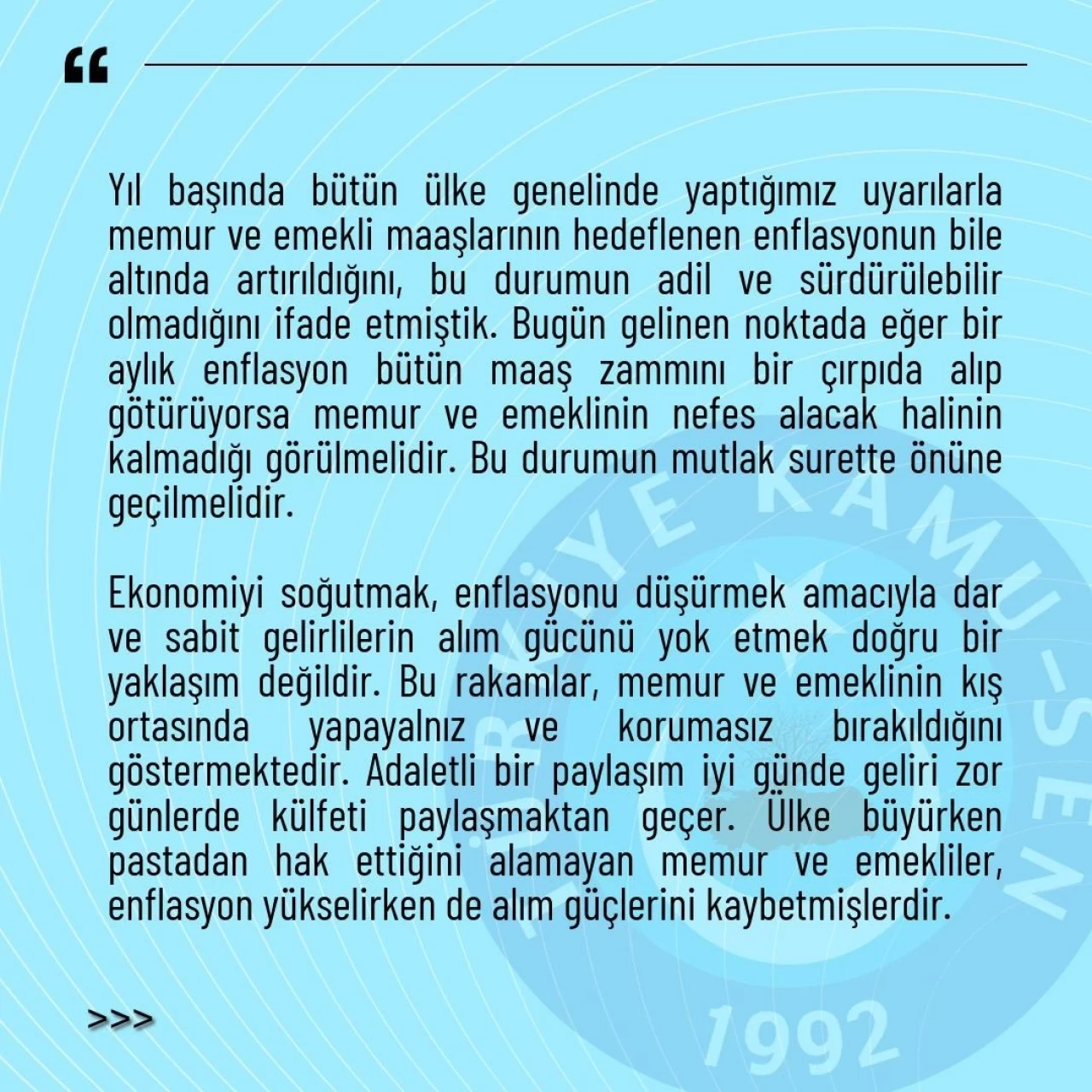 Yıl başında bütün ülke genelinde yaptığımız uyarılarla memur ve emekli maaşlarının hedeflenen enflasyonun bile altında artırıldığını, bu durumun adil ve sürdürülebilir olmadığını ifade etmiştik. Bugün gelinen noktada eğer bir aylık enflasyon bütün maaş zammını bir çırpıda alıp götürüyorsa memur ve emeklinin nefes alacak halinin kalmadığı görülmelidir. Bu durumun mutlak surette önüne geçilmelidir.