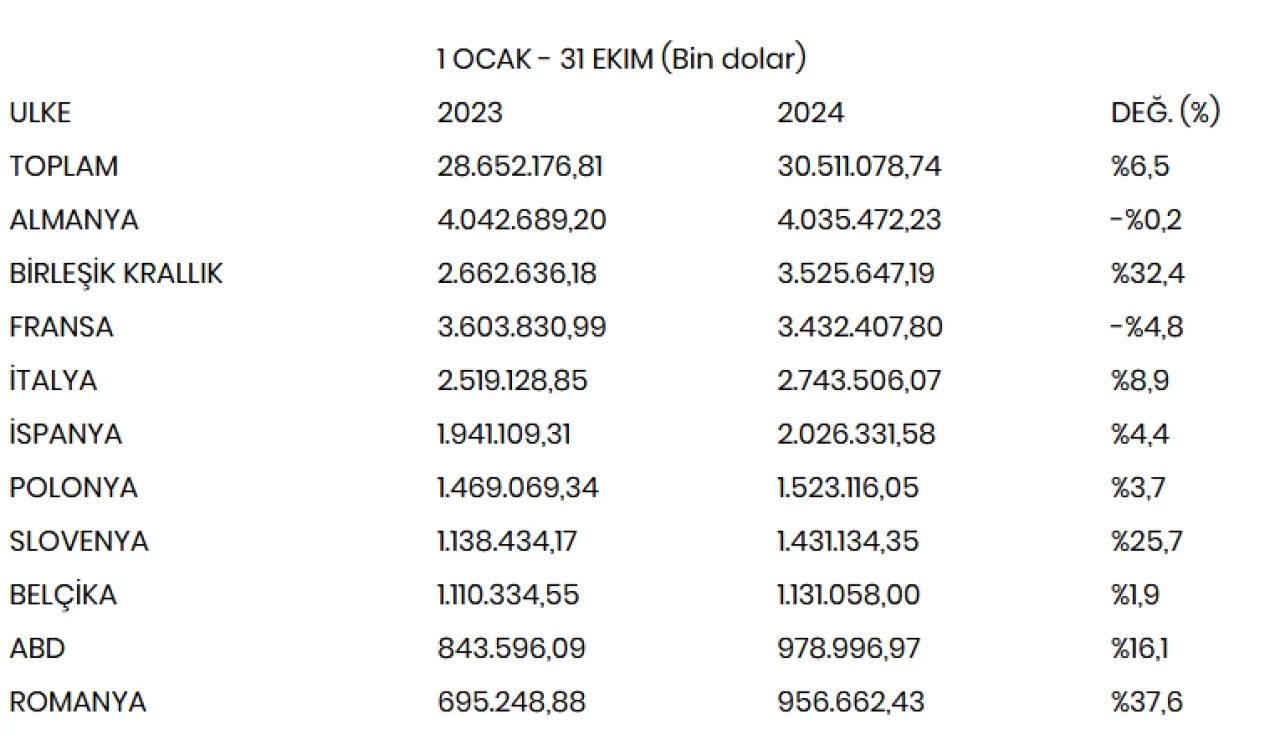 Değer bazında ihracat artışında Birleşik Krallık zirvede yer aldı. Ocak-ekim döneminde otomotiv sektörünün ülkeye dış satımı 863 milyon dolar arttı. İhracat artışında bu ülkeyi 292,7 milyon dolarla Slovenya, 261,4 milyon dolarla Romanya, 224,4 milyon dolarla İtalya, 135,4 milyon dolarla ABD izledi.