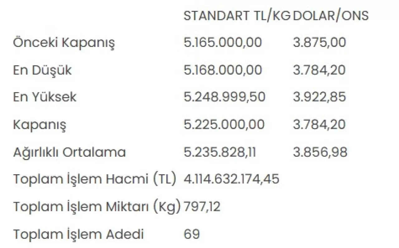 KMKTP'de altında toplam işlem hacmi 4 milyar 114 milyon 632 bin 174,45 lira, işlem miktarı ise 797,12 kilogram oldu.