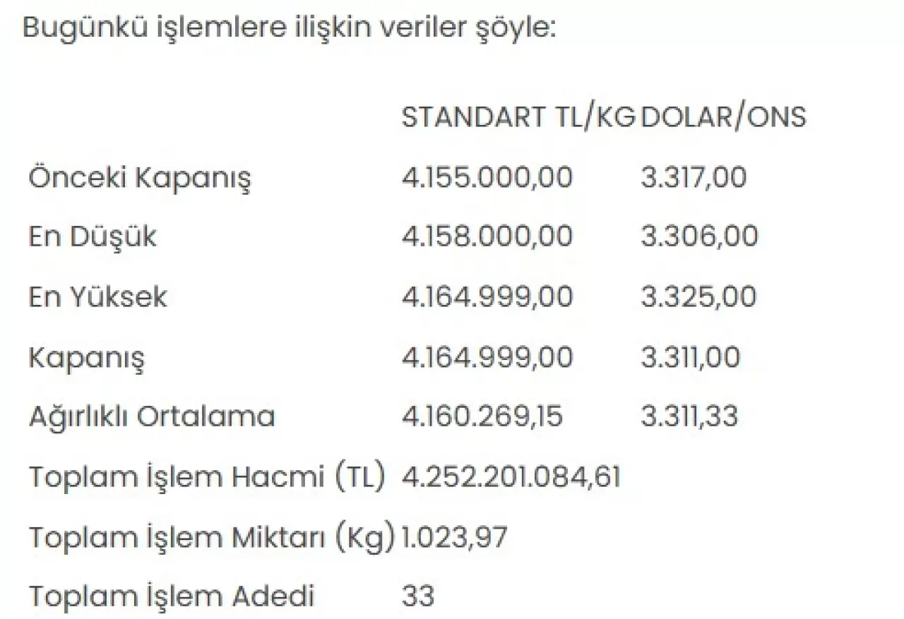 Altın piyasasında gerçekleşen toplam işlem hacmi 4 milyar 252 milyon 201 bin 84,61 lira olurken, işlem miktarı 1.023,97 kilogram olarak kaydedildi. Tüm kıymetli metallerdeki toplam işlem hacmi ise 4 milyar 261 milyon 969 bin 247,59 liraya ulaştı.
