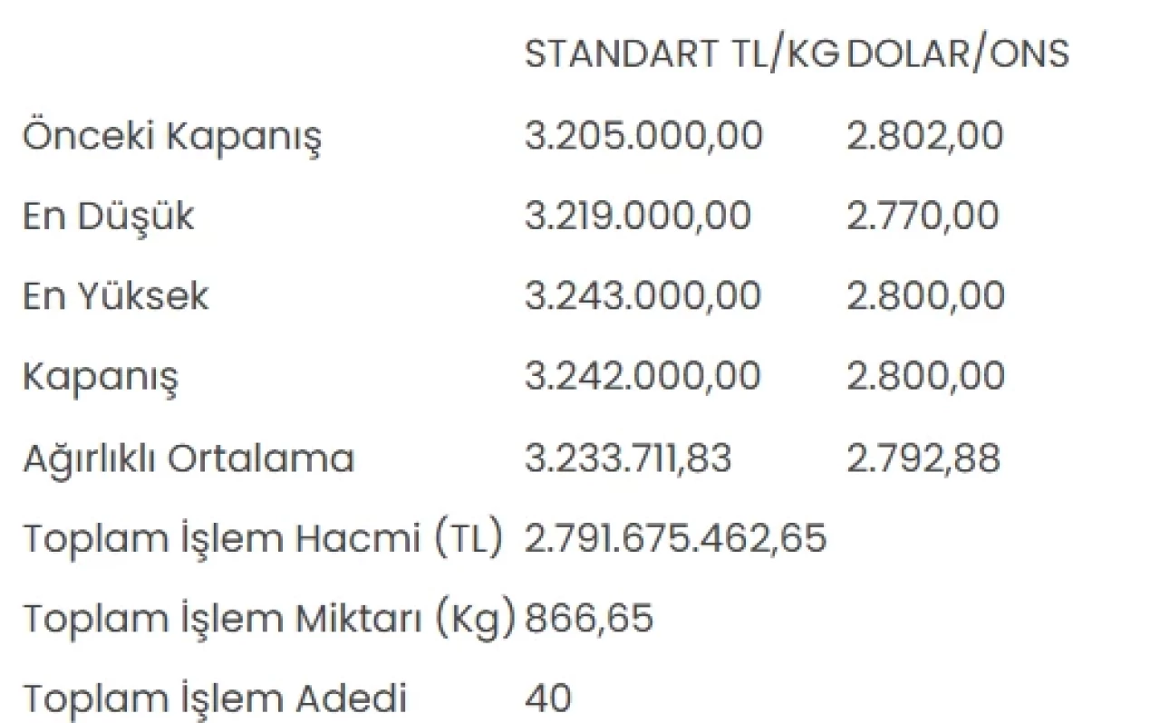 KMKTP'de altında toplam işlem hacmi 2 milyar 791 milyon 675 bin 462,65 lira, işlem miktarı ise 866,65 kilogram oldu.