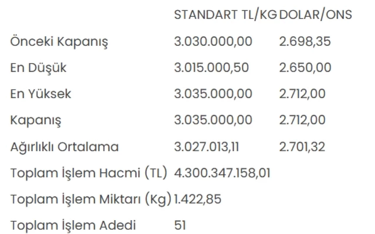 Borsa İstanbul Kıymetli Madenler ve Kıymetli Taşlar Piyasası'nda (KMKTP) standart altının kilogram fiyatı 3 milyon 35 bin liraya çıktı.