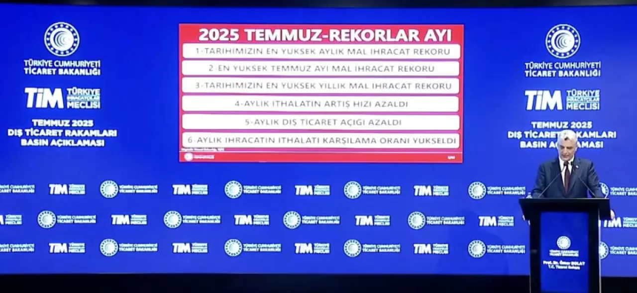 Temmuz 2025 efsane bir ay oldu. Birçok alanda rekorlar kırıldı. Tarihimizin en yüksek aylık mal ihracat rekorunu temmuzda kırdık. Tarihimizin en yüksek ihracat rekorunu kırdık. Aylık ithalat hızında bir yavaşlama yaşandı; hazirana kıyasla azaldı. İhracatın ithalatı karşılama oranı yükseldi.
