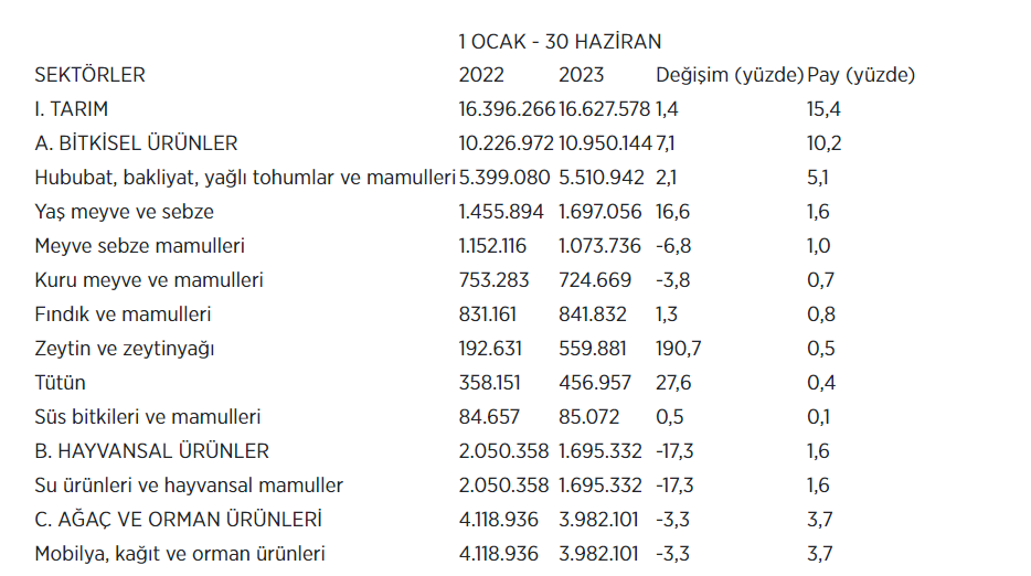 TİM verilerine göre, bu yıl ve 2022'nin ocak-haziran döneminde tarım ve tarıma bağlı sektörlerin ihracatı (dolar) şöyle: