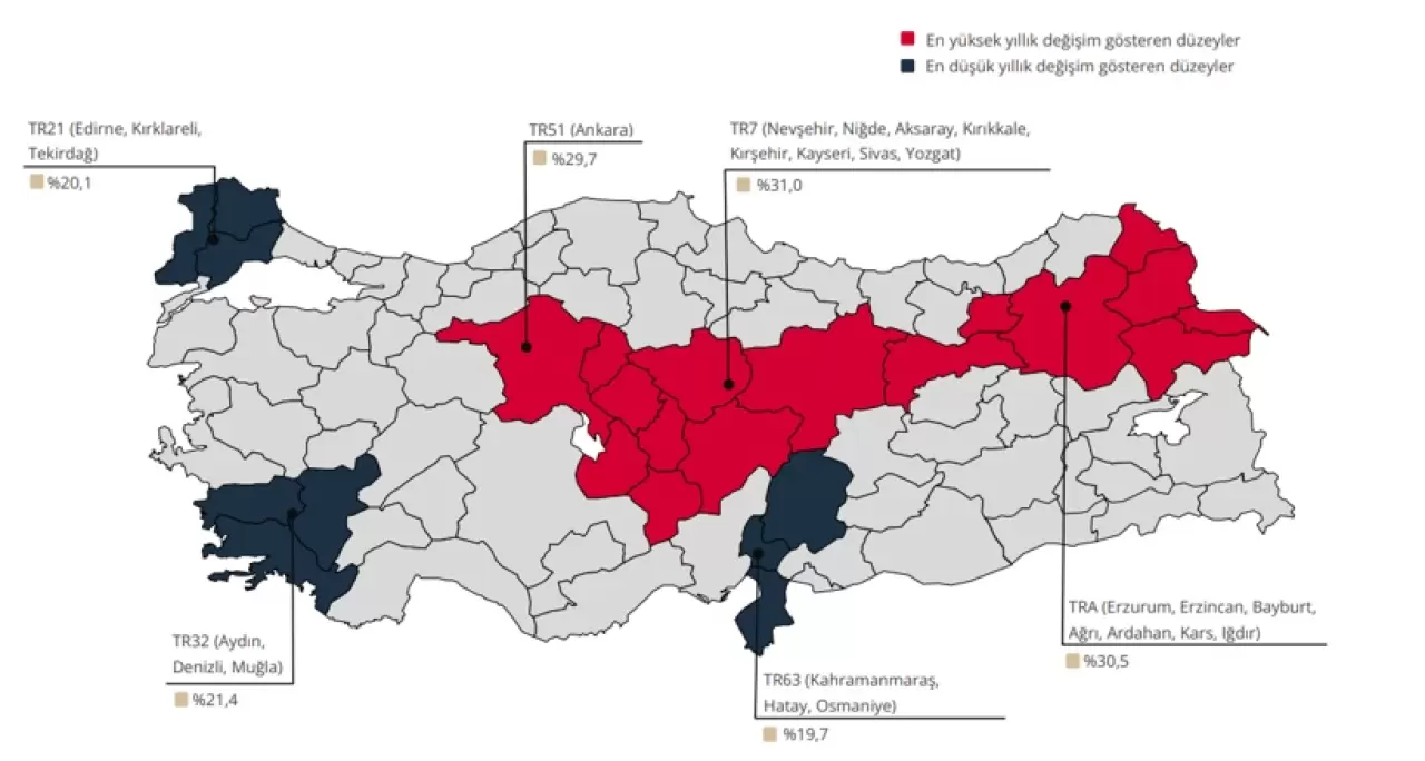 İstatistiki Bölge Birimleri Sınıflamasına göre bölgelerin yıllık konut fiyat endeksi değişimleri incelendiğinde, Şubat 2026 döneminde en yüksek yıllık artış yüzde 31,0 ile Nevşehir, Niğde, Aksaray, Kırıkkale, Kırşehir, Kayseri, Sivas, Yozgat bölgesinde, en düşük yıllık artış ise yüzde 19,7 ile Hatay, Kahramanmaraş, Osmaniye bölgesinde gözlenmiştir.
