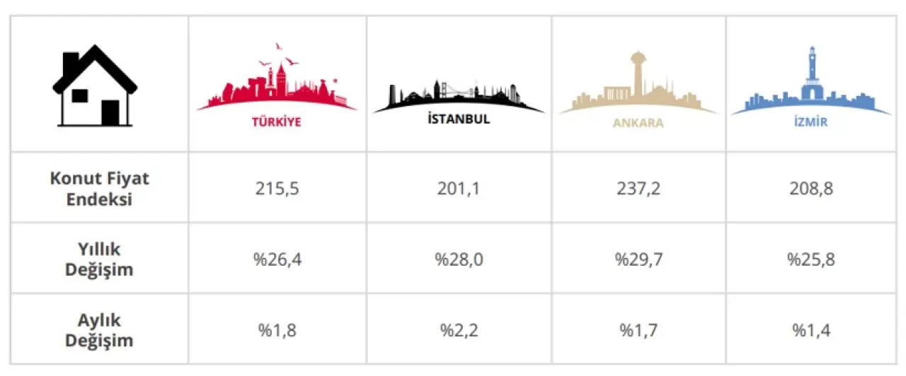2026 yılı Şubat ayında, İstanbul, Ankara ve İzmir'de bir önceki aya göre, sırasıyla yüzde 2,2, 1,7 ve 1,4 oranlarında artış gözlenmiştir. Endeks değerleri bir önceki yılın aynı ayına göre, İstanbul, Ankara ve İzmir'de sırasıyla yüzde 28,0, 29,7 ve 25,8 oranlarında artış göstermiştir.