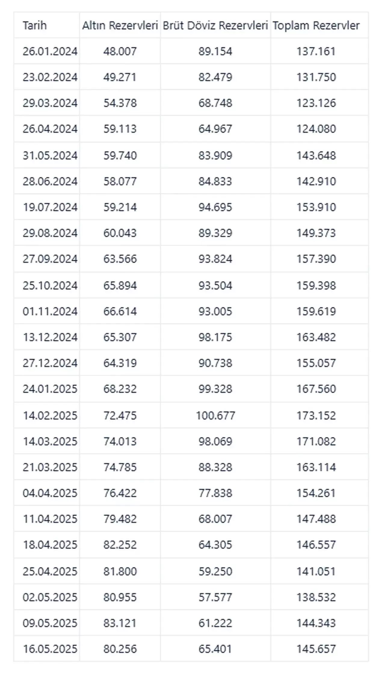 Böylece Merkez Bankasının toplam rezervleri, 16 Mayıs haftasında bir önceki haftaya göre 1 milyar 314 milyon dolar artışla 144 milyar 343 milyon dolardan 145 milyar 657 milyon dolara çıktı.