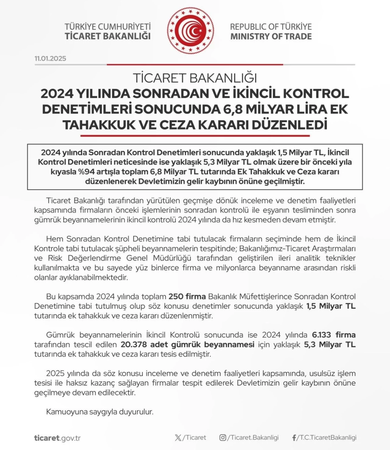 Bakanlıktan yapılan açıklamada, "2024 yılında Sonradan Kontrol Denetimleri sonucunda yaklaşık 1,5 milyar TL, İkincil Kontrol Denetimleri neticesinde ise yaklaşık 5,3 milyar TL olmak üzere bir önceki yıla kıyasla yüzde 94 artışla toplam 6,8 milyar TL tutarında Ek Tahakkuk ve Ceza kararı düzenlenerek devletimizin gelir kaybının önüne geçilmiştir." denildi.