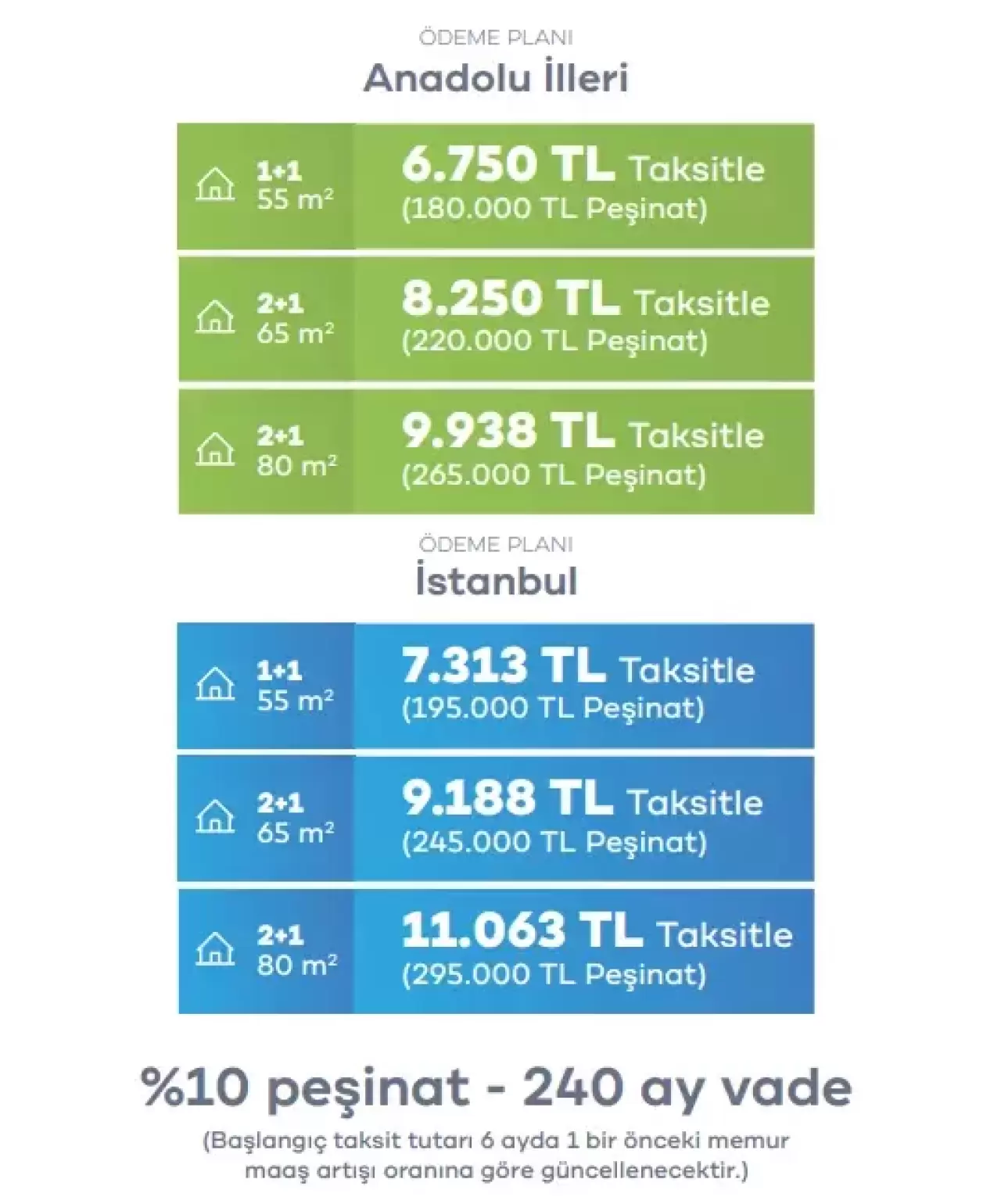 55 metrekare 1+1 evler 180.000 TL peşinat ve ayda 6.750 TL taksitle,