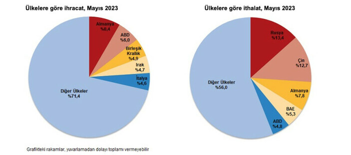 İthalatta Rusya Federasyonu ilk sırayı aldı. Mayıs ayında Rusya Federasyonu'ndan yapılan ithalat 4 milyar 569 milyon dolar olurken, bu ülkeyi sırasıyla; 4 milyar 347 milyon dolar ile Çin, 2 milyar 671 milyon dolar ile Almanya, 1 milyar 809 milyon dolar ile BAE, 1 milyar 633 milyon dolar ile ABD izledi. İlk 5 ülkeden yapılan ithalat, toplam ithalatın yüzde 44'ünü oluşturdu.